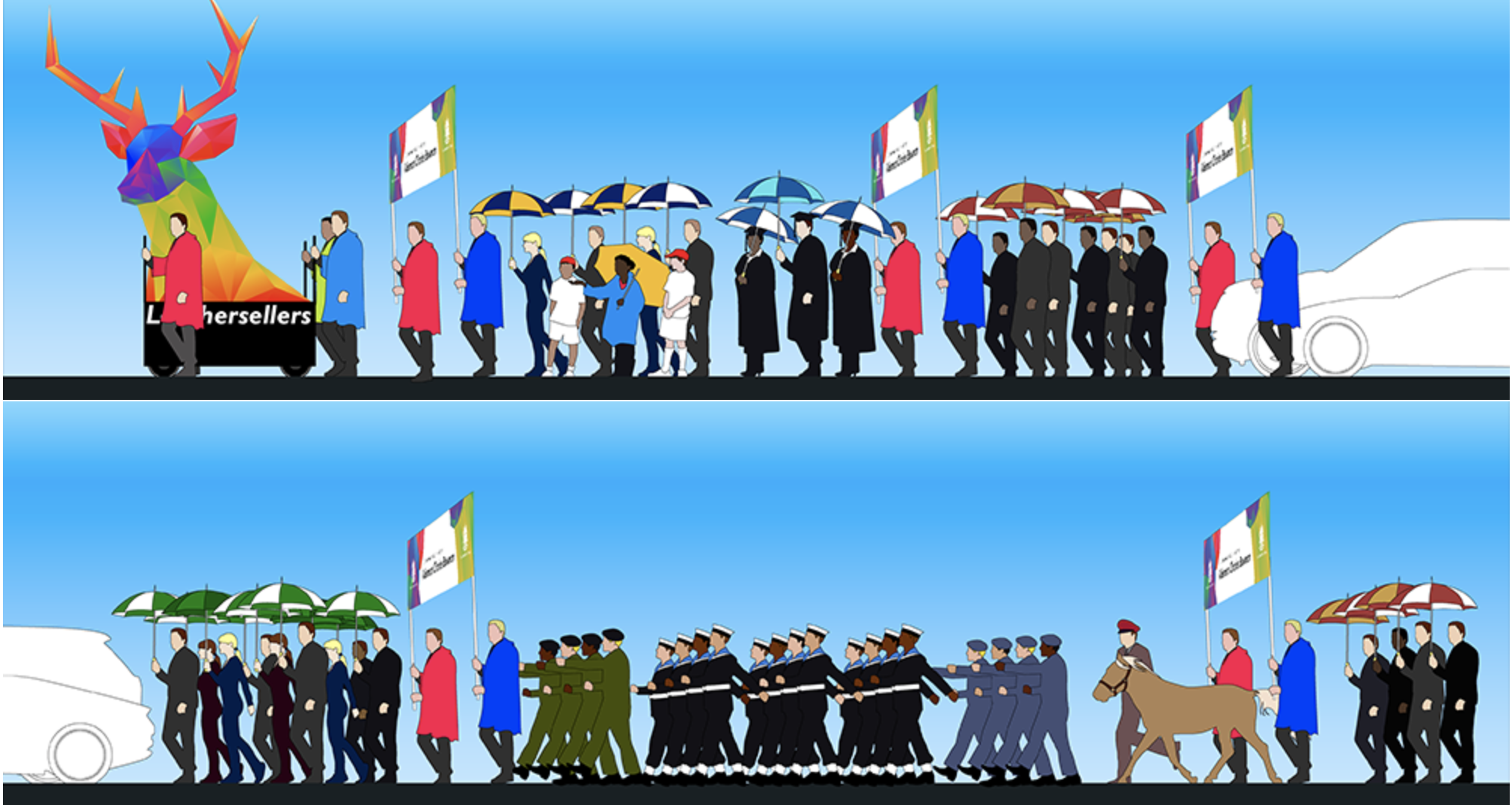 The proposal had to take into account all the contributors to the Leathersellers parade. From educational and charitable groups to the worshipful members and various military affiliations. Our solution involved the re-working of the livery crest into a low poly multi-coloured deer head; a radical departure that with client approval, we were able to weave through every element of the design.